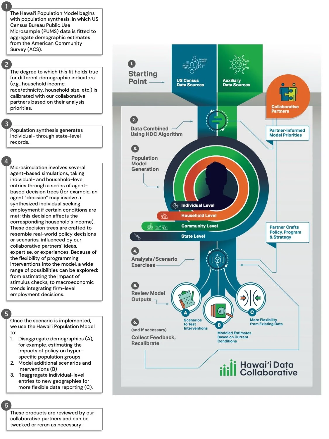 The Hawai‘i Population Model (HPM) is an anonymous estimated representation of all individuals and households in Hawai‘i. Derived from US Census data, the HPM uses a sophisticated statistical algorithm to generate a responsive model of Hawai‘i’s population that accounts for a wide range of characteristics including household size, income, age, ethnicity, geography, occupation, and more.